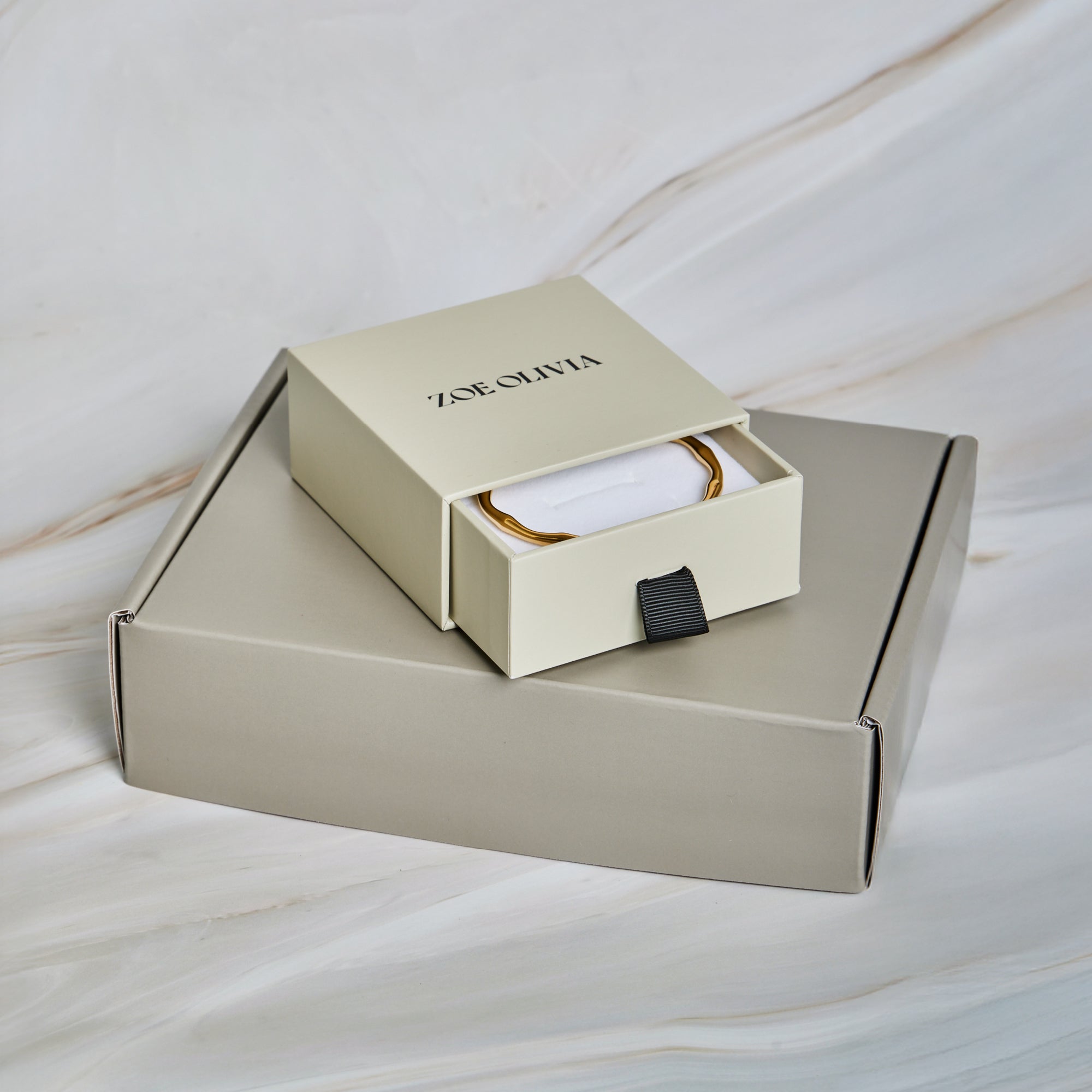 Perfect for gifting: certain Zoe Olivia pieces arrive beautifully presented in our signature soft-touch box, designed with understated elegance and a coastal-inspired neutral palette. Nestled in protective cushioning and finished with a sleek black ribbon tab, your jewellery is not only secure but gift-ready straight from the box - whether it’s a special occasion or a well-deserved treat for yourself.