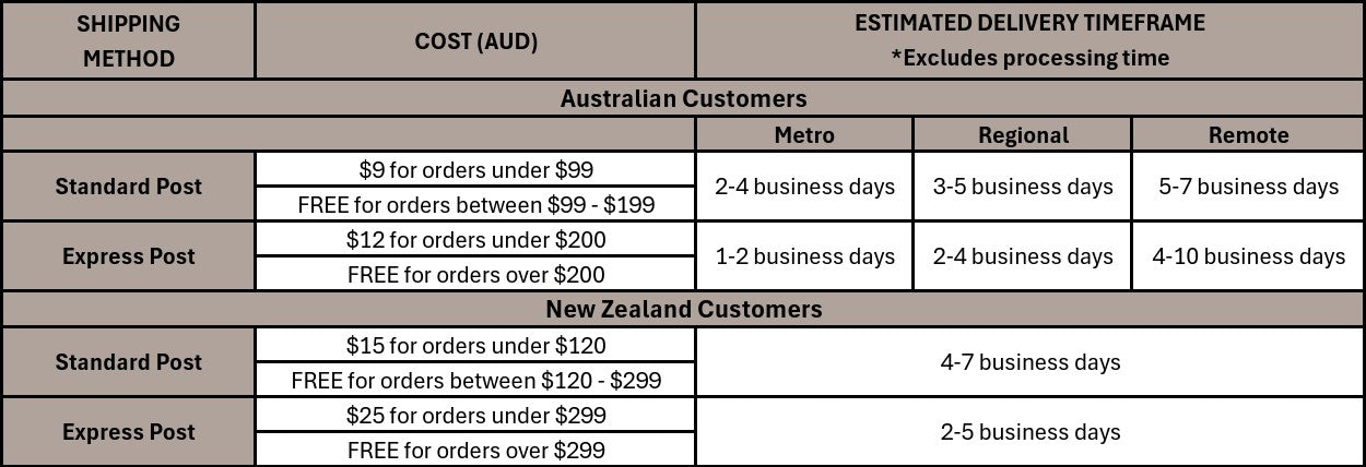 All orders are dispatched from our warehouse with ‘Signature Required on Delivery’ to prevent theft. If you select ‘Authority to Leave’ during delivery or have Australia Post's 'Safe Drop' function set up, we are not liable for any lost deliveries.